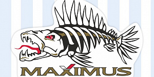 Наклейка с логотипом Maximus в форме скелета рыбы на белом фоне. Предназначена для брендирования катера, автомобиля, витрины/двери магазина.