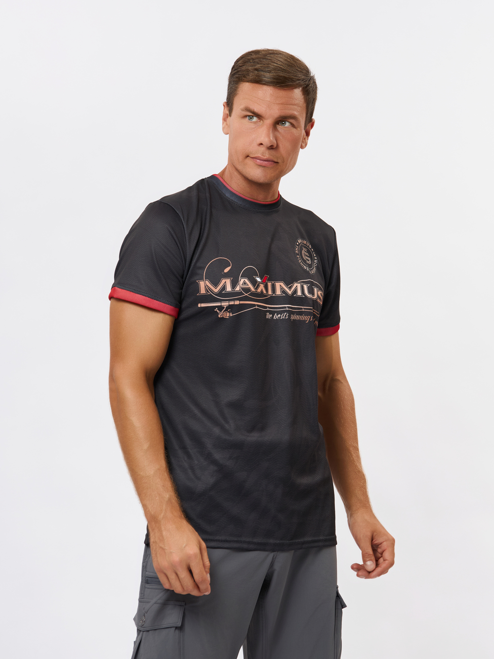 Стильная принтованная футболка из стретч-полиэстера с классическим круглым вырезом и коротким рукавом. На груди и спине большой логотип Maximus.
